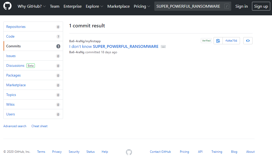 랜섬웨어 이름이 등장합니다! 추가로 최근 트윗에 'c2 서버의 코드를 모두 커밋했다' 라는 내용이 존재합니다. 따라서 github에서 랜섬웨어의 이름을 토대로 검색해봅시다.
