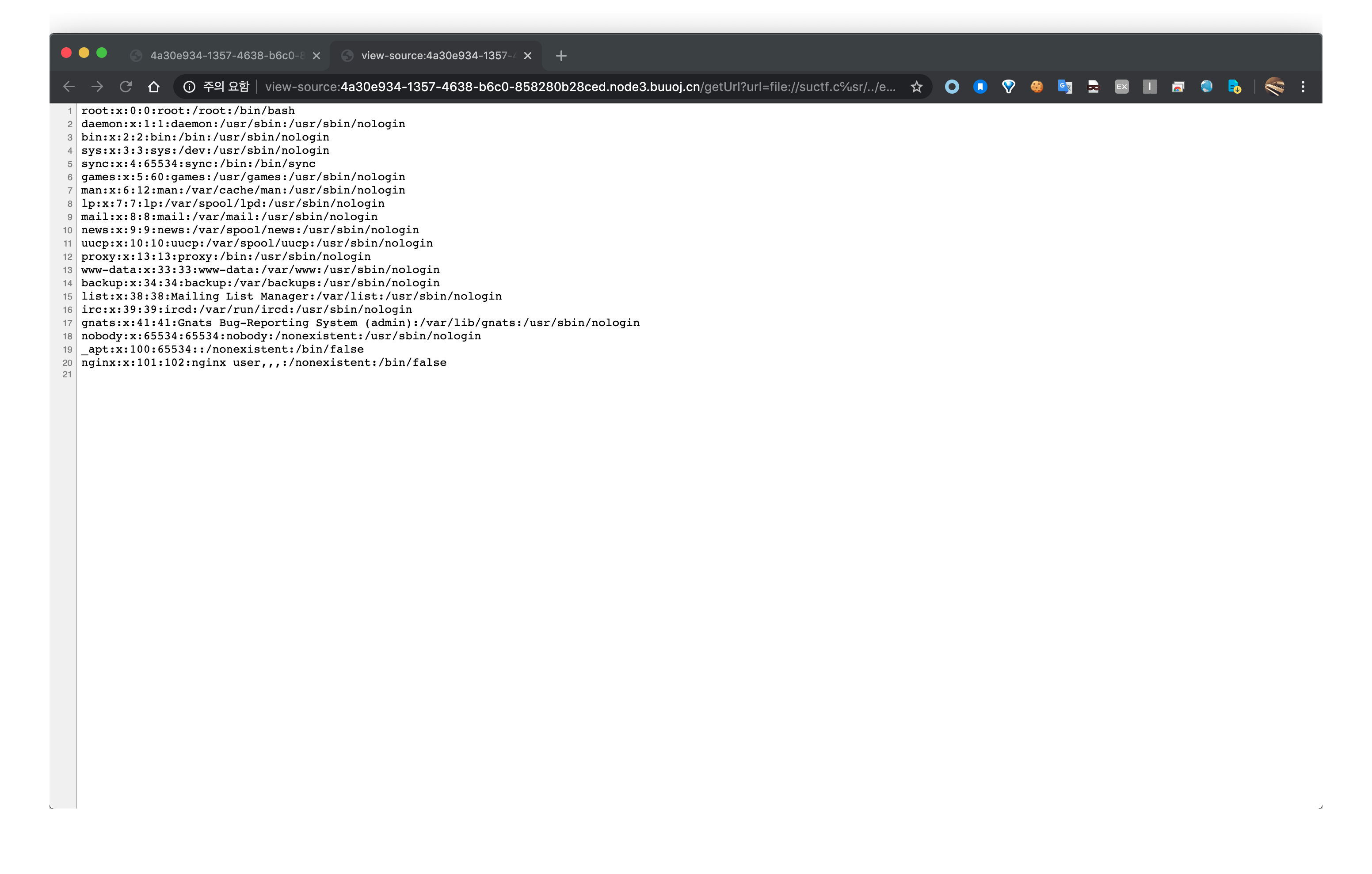 내 파이썬 환경에서 urllib.urlopen('file:') 스키마에서 어떻게해도 문제 풀이처럼 file://suctf.cc/opt/../etc/passwd 를 열 수가 없다.