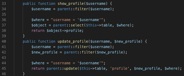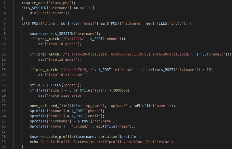 쨌든, config.php에 flag가 변수로 박혀있는데, 이로 미루어보아 profile.php의 file_get_contents($profile['photo'])에 photo를 오염시켜 config.php를 불러오도록 lfi를 터트려야 하는게 최종 목적일것이다.