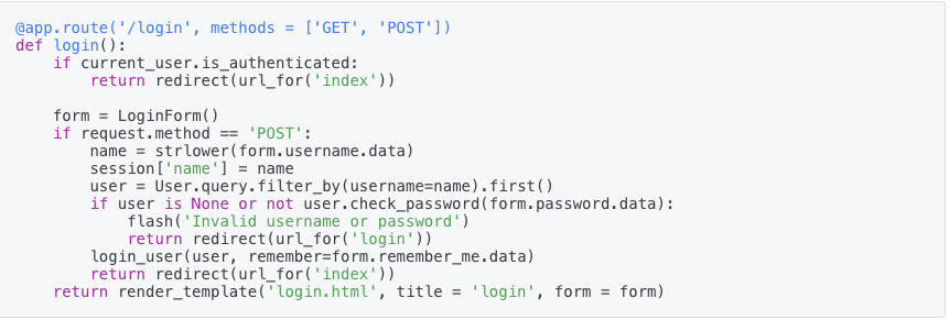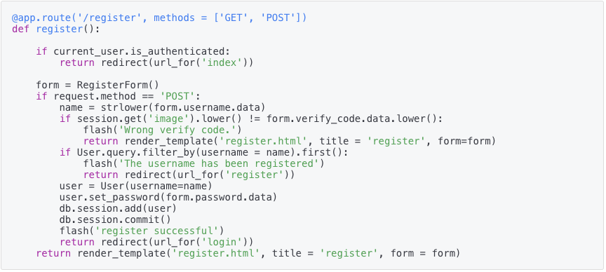 userinput인 username을 strlower()로 던져 그 결과를 가지고 if User.query.filter_by(username=name).first() 구문으로 중복 회원 검사를 한다.